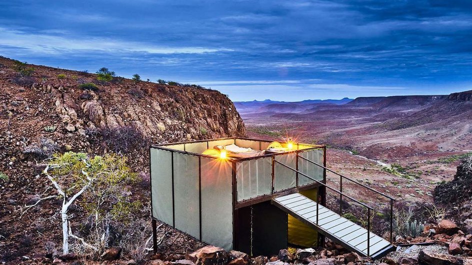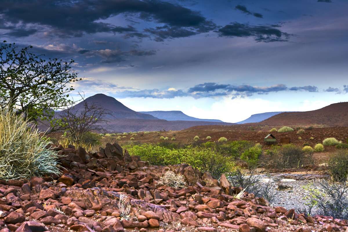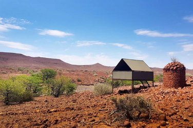 1. TAG: Etendeka Berge. (± 6 km/3 Std.). Individuelle Anreise in die Palmwag Lodge. Hier parken Sie Ihr Auto und um 16.00 Uhr treffen auf Ihre Reisegruppe und den Reiseleiter. Sorgfältig gibt er Ihnen Tipps und Tricks und erklärt Ihnen was Sie die nächsten Tage erwarten wird. Ihr Gepäck wird bereits in Ihr Camp gefahren, Sie müssen nur Ihren Tagesrucksack mitnehmen. Die erste Wanderung bietet spektakuläre Ausblicke über unberührte Felsformationen. Ihr erstes Camp liegt an einem ausgetrockneten Flussbett. Sie übernachten in komfortablen Betten auf einer der fünf erhöhten Plattformen. Am Tag bietet ein Dach Schatten, in der Nacht wird das Sonnendach entfernt, somit haben Sie den Blick frei und können das afrikanische Sternenzelt in vollen Zügen geniessen. Die Plattform ist mit einer Toilette und einem Lavabo ausgestattet. Eine Buschdusche teilen sich je zwei Zelte. Das Abendessen wird vom Personal über dem Feuer zubereitet. Übernachtung Fly-Camp (A)