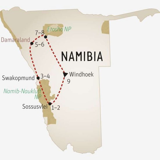 9. TAG: Etosha Nationalpark–Windhoek. Nach dem Frühstück starten Sie zu Ihrem ca. 2½–stündigen Rückflug nach Windhoek. Die Reise endet am Internationalen Flughafen von Windhoek. (F)