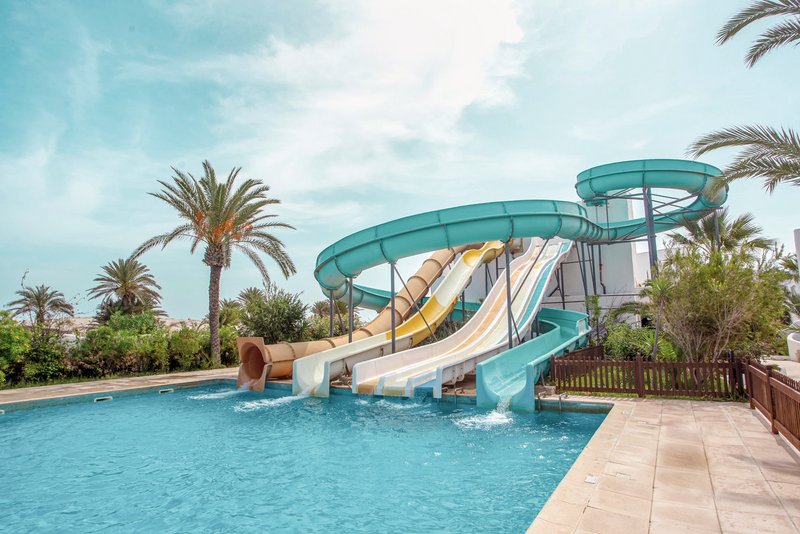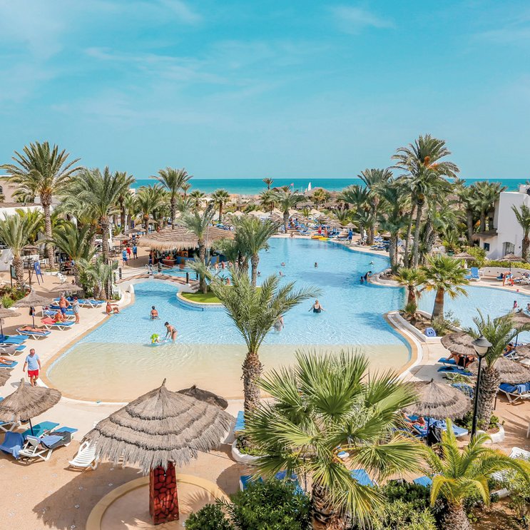 Hotel im Stil eines djerbischen Dorfes inmitten eines 5 Hektar großen Palmengartens. Der Aquapark sorgt für Spaß bei Groß und Klein.