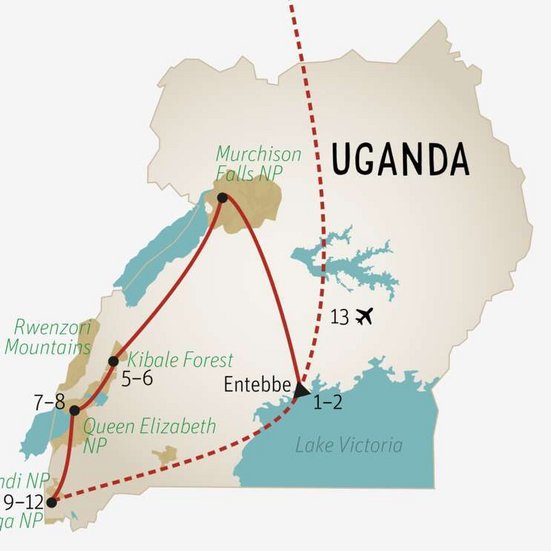 12. TAG: Bwindi Nationalpark–Entebbe. Nach dem Frühstück verabschieden Sie sich von der wunderschönen Natur, die Sie umgibt, und fliegen mit dem Kleinflugzeug nach Entebbe. Hier steht Ihnen ein Tageszimmer zur Verfügung, bis der Transfer zum Flughafen stattfindet. (FA)
