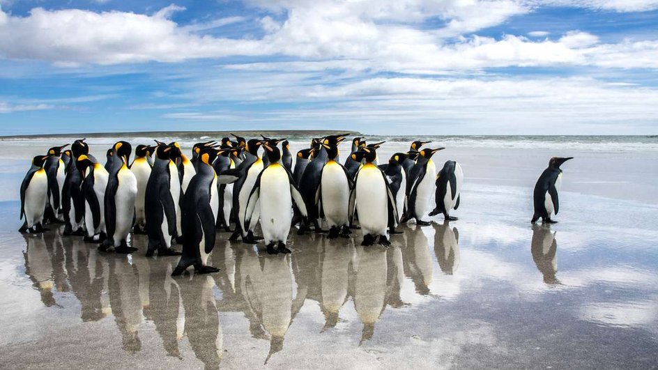 Rückflug nach Stanley. Am nächsten Tag Ausflug zum Volunteer Point. Hier begegnet man der grössten Kolonie der Königs-Pinguine auf den Falkland-Inseln. Es ist einer der wenigen Plätze ausserhalb der Antarktis, an denen man diese anmutigen Tiere beobachten kann.