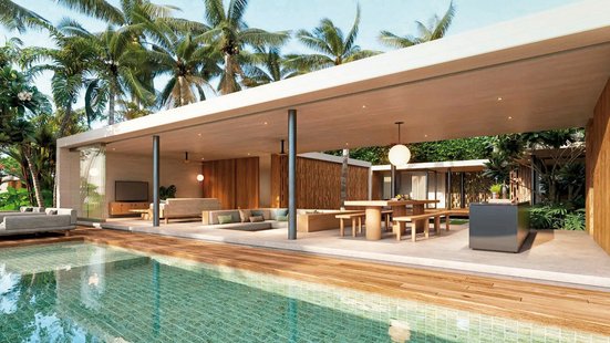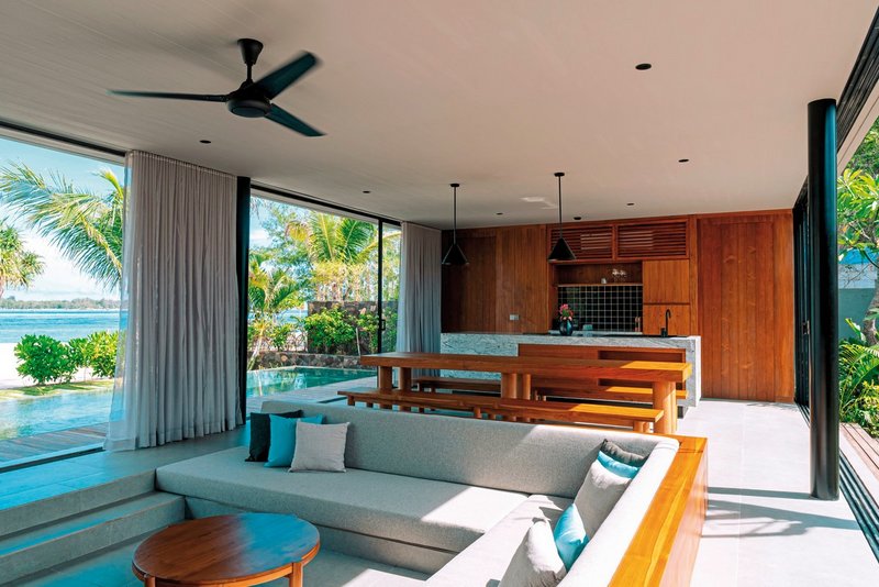 One Bedroom Beachfront ca. 165 qm: Wohn- und Essbereich, Terrasse mit privatem Pool.