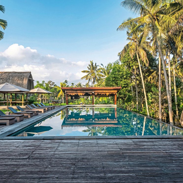 Überragt von Kokospalmen, umgeben von Reisfeldern und in der Nähe plätschert ein Fluss: Dank Nähe zur Natur und balinesischem Charme ist das kleine Hotel eine Oase der Ruhe und der Erholung.