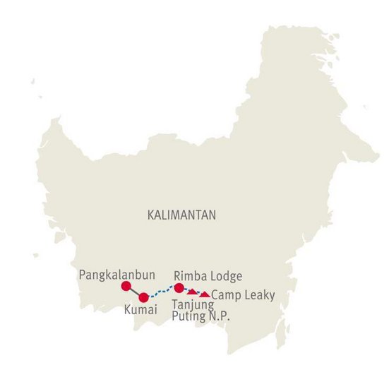Der Tanjung Puting Nationalpark erstreckt sich über 3‘000km² und ist heute der wichtigste Lebensraum der Orang Utans und Langnasen-Affen. Der Park umfasst Sumpfgebiete und Trockenwald. Sie besuchen Camp Leakey, eine Forschungsstation, die vom WWF unterstützt wird. Dort werden Orang Utans auf die Rückkehr in die freie Wildbahn vorbereitet. Die Fütterungsplattformen werden, vor allem in der Trockenzeit, auch gerne von frei lebenden Tieren besucht. Sie wandern in den Dschungel, um die Fütterung zu beobachten. Die Begegnung mit den Menschenaffen ist ein ganz besonderes Erlebnis.