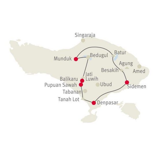 Der mystische Luhur Batukaru und die Reisterrassen von Jatiluwih gehören heute zu den Höhepunkten. Durch abwechslungsreiche Landschaft mit Wasserfällen, Zwillingsseen und Reisterrassen gelangen Sie nach Munduk.