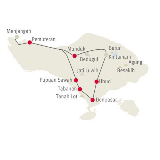 Sie starten den Tag mit einem Besuch des Meerestempels Tanah Lot und spazieren über den farbenfrohen Markt von Tabanan. Durch eine fast mystische Landschaft erreichen Sie den Batukaru Tempel im Bergdschungel. Die Reiseleitung gibt Ihnen spannende Einblicke in die balinesische Kultur. Beim Rundgang durch den Balikaru Kräuter- und Gewürzgarten lernen Sie die Zutaten der balinesischen Küche kennen. Via die atemberaubenden Reisterrassen von Jatiluwih führt die Route durch eine liebliche Landschaft bis Pupuan Sawah.