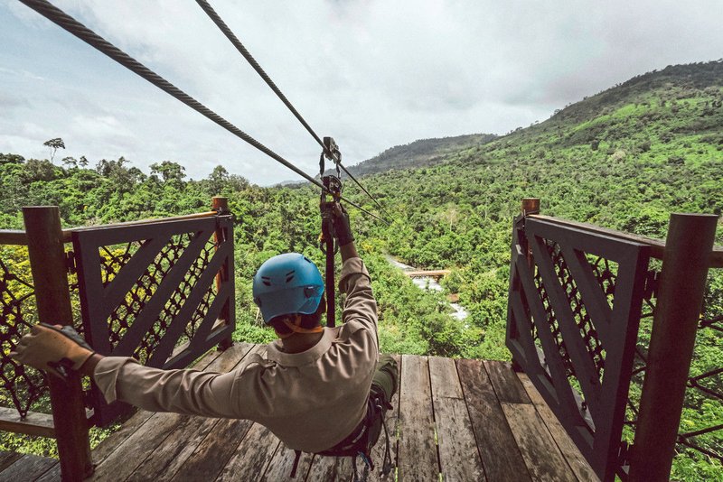 Sport & Freizeit: Neben Mountainbiking, Kajakfahren, Ziplining, Vogel- und Schmetterlingsbeobachtung, Angeln und Kochkursen bietet das Shinta Mani Wild – A Bensley Collection eine Reihe von aufregenden Ausflügen mit Expeditionsbooten des Camps in die unberührte Flussmündung an. Ein intensives Dschungelerlebnis ist garantiert, wenn Sie mit den Rangern patrouillieren, Kamerafallen überprüfen und mit etwas Glück Gibbons, Elefanten oder Bären aus nächster Nähe sehen. Es werden auch geführte Wanderungen angeboten, bei denen Sie spektakuläre Hängebrücken überqueren und an bezaubernden Orten picknicken können.