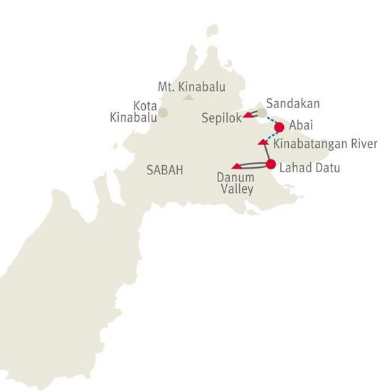 Die Auswilderungsstation für Orang Utans in Sepilok ist der erste Höhepunkt. Zurückgelassene Jungtiere und verletzte Orang Utans werden hier gepflegt und darauf vorbereitet, wieder in ihren natürlichen Lebensraum zurückzukehren. Bei der Fütterung können Sie die wunderschönen Tiere beobachten. Auf der anderen Seite des Geländes warten die Sonnenbären auf Ihren Besuch, die kleinsten Bären der Welt. Flussaufwärts fahren Sie ins Dschungel-Camp bei Abai. In der Dämmerung besteigen Sie das Boot für die Tierbeobachtung. Zu dieser Zeit ist viel los in den Wipfeln der Urwaldriesen. Glühwürmchen hängen zwischen den Bäumen als wären sie eine Lichterkette am Weihnachtsbaum.