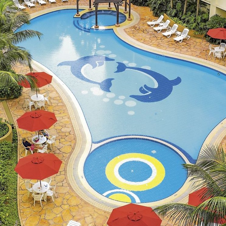 Stattliche Marmorsäulen und edle Kronleuchter begrüßen Sie in der Lobby. Familien mit Kindern freuen sich über die Themenzimmer: Unterwasserwelten, Piratenszenen, Schlosskulisse.