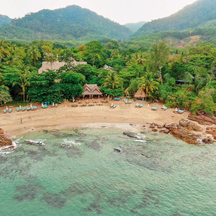 Traditionelle Bungalowanlage mit einzelnen, auf Pfählen stehenden Bungalows.