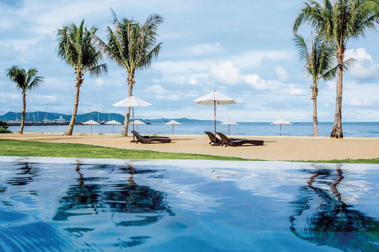 Jomtien: Weitläufiger Sandstrand mit Palmen und Pinienbäumen.