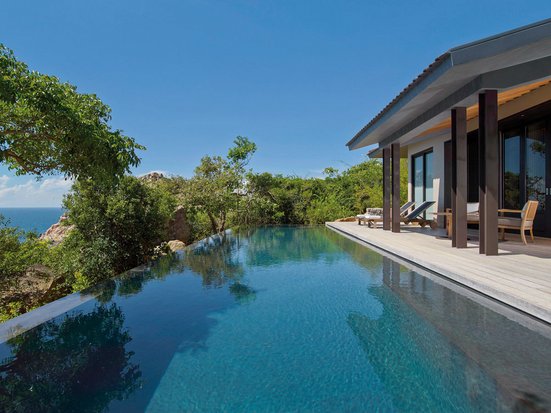 Amanoi Ocean Pool Villa (6) ca 270 qm: Geräumiges Sonnendeck und Pool mit Blick auf das Meer und die Bucht Vinh Hy Bay.