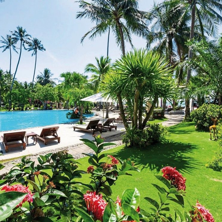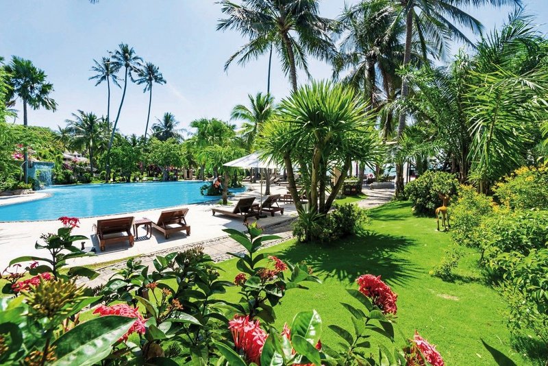 Gartenanlage mit vielen Kokosnusspalmen