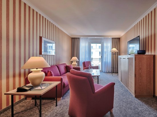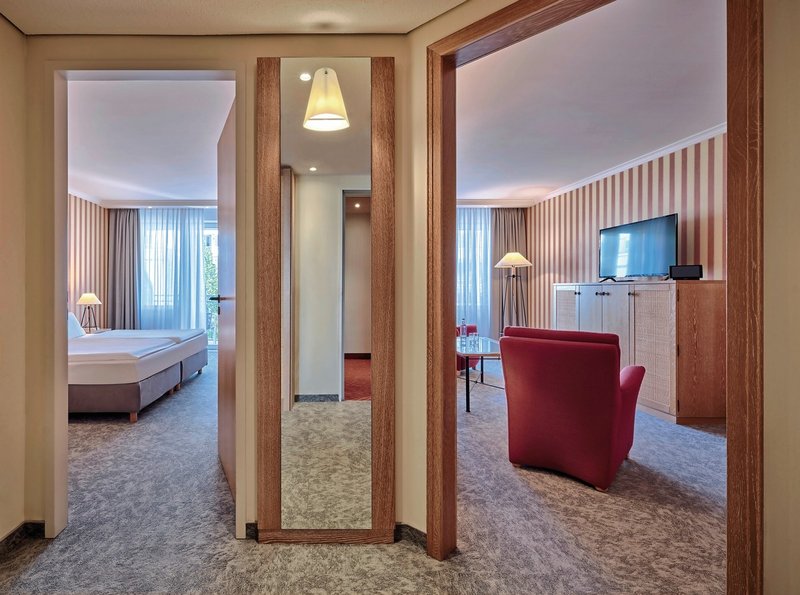 - 41-45 qm, Juniorsuite, Etage, 3., Landseite, 1 separates Schlafzimmer, kombinierter Wohn-/Schlafraum, Sitzecke, Doppelbett, Sofabett, Badewanne, Bademantel, Badeslipper, Haartrockner, Mini-Kühlschrank, Safe, 2 TVs (Sat-TV, Flachbildschirm), bei Ankunft im Zimmer Wasser
