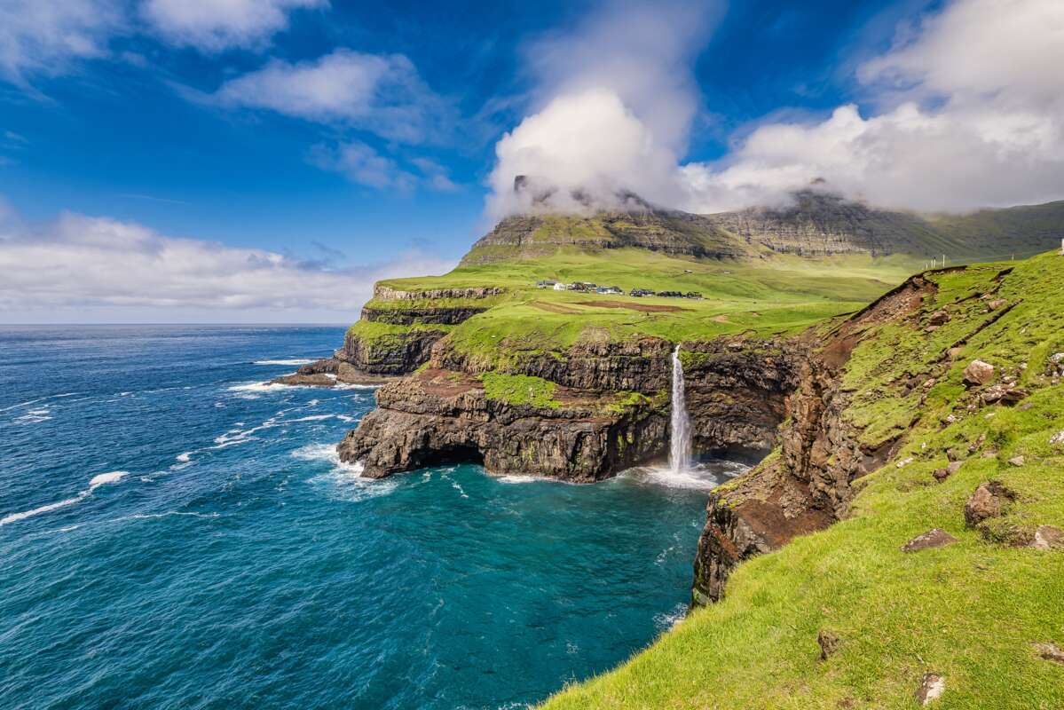 Erkunden Sie die Insel Vágar. Auf der Fahrt entlang der Küste haben Sie eine gute Sicht auf die eindrückliche Insel Tindhólmur. In Gásadalur finden Sie ein kleines Café, einen schönen Aussichtspunkt sowie den Wasserfall Múlafossur. Ab Sørvágur werden Bootstouren zum Felsbogen Drangarnir und der Insel Tindhólmur angeboten.