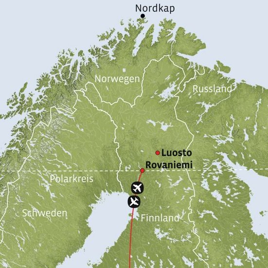 Direktflug nach Rovaniemi und organisierter Transfer zur Unterkunft.