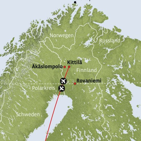 Direktflug nach Kittilä und Mietwagen-Übernahme. Nach ca. 45 Minuten erreichen Sie das Dorf Äkäslompolo.