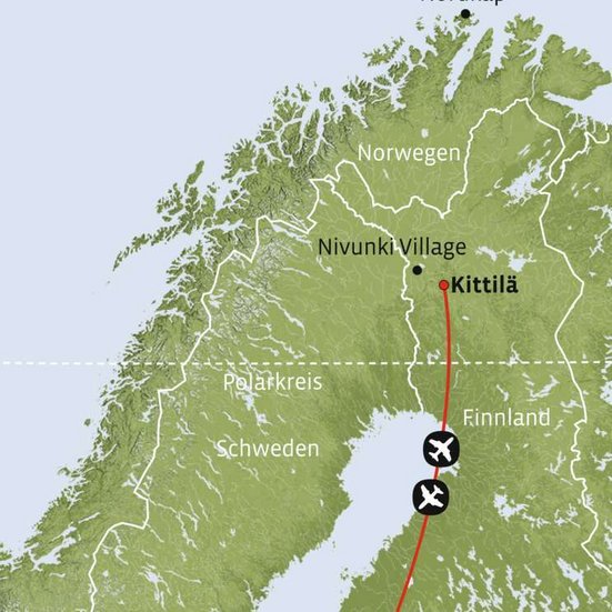Heute heisst es Abschied nehmen. Transfer zum Flughafen Kittilä und Rückreise mit dem Direktflug in die Schweiz.