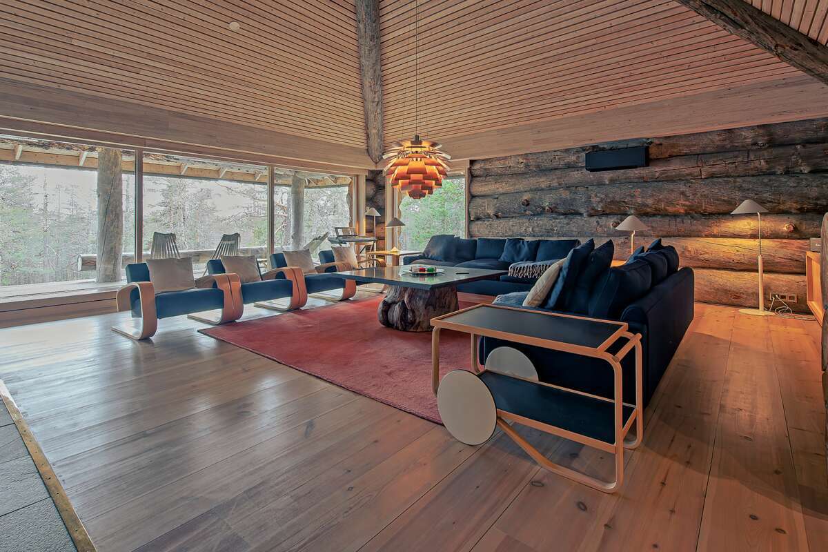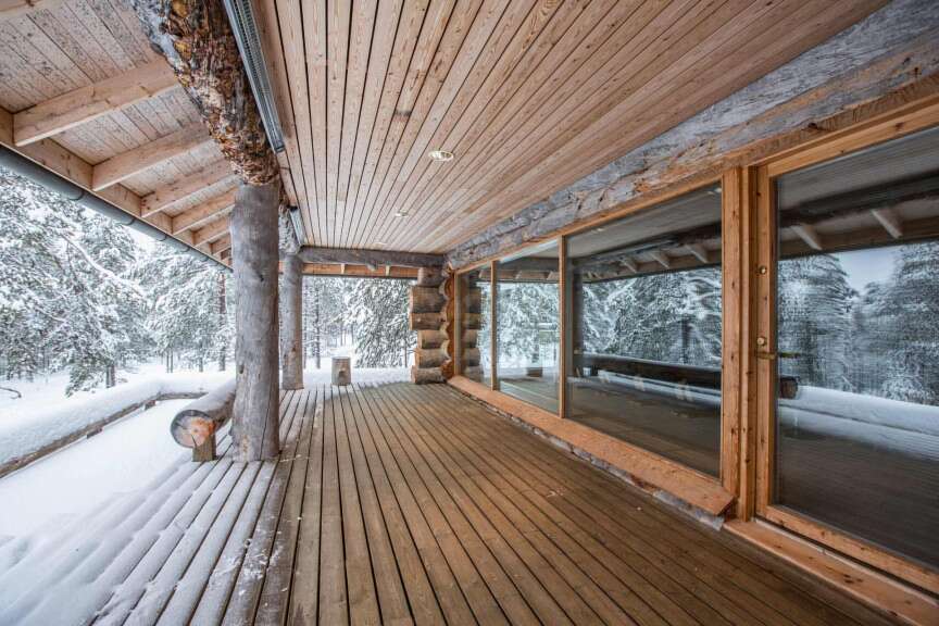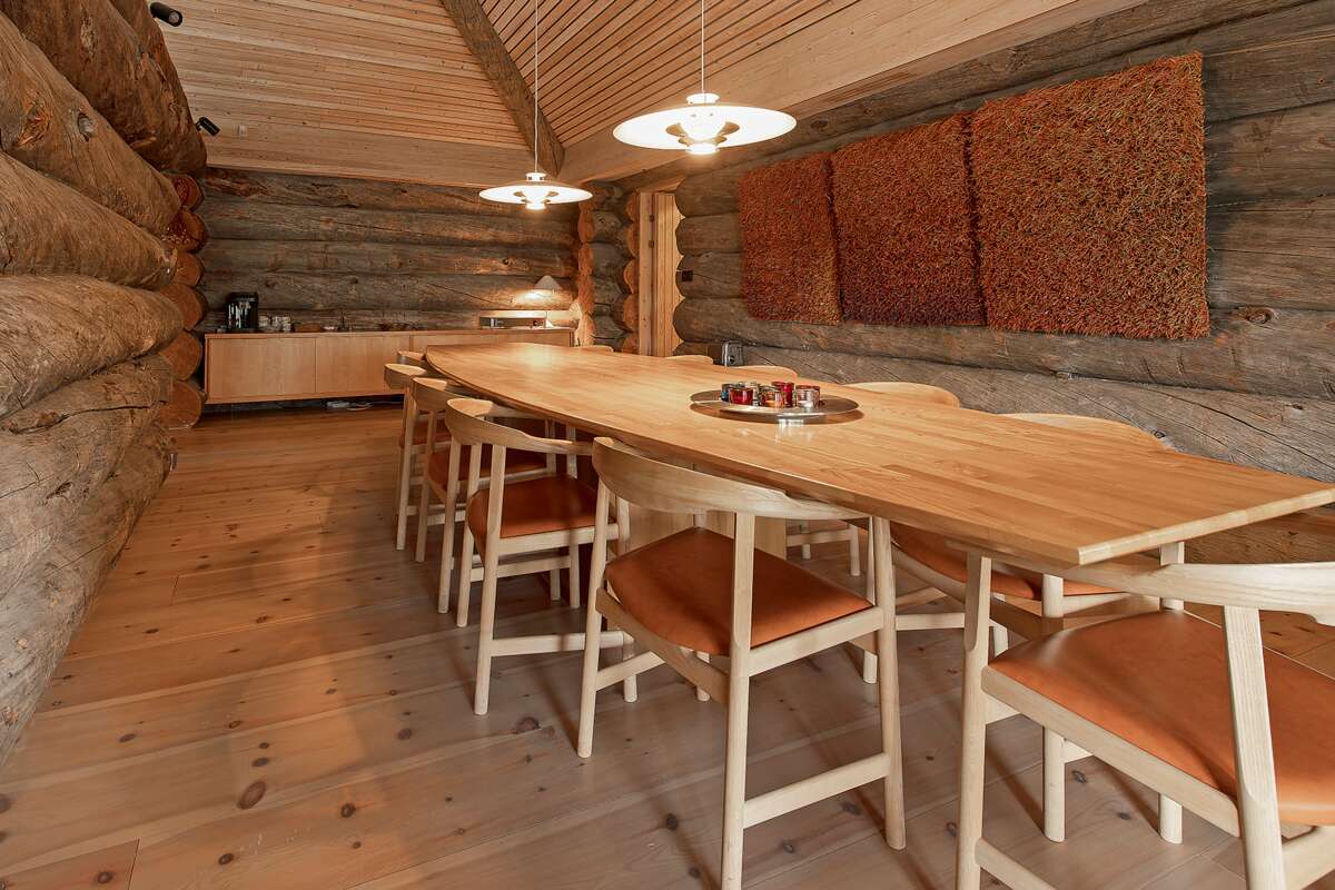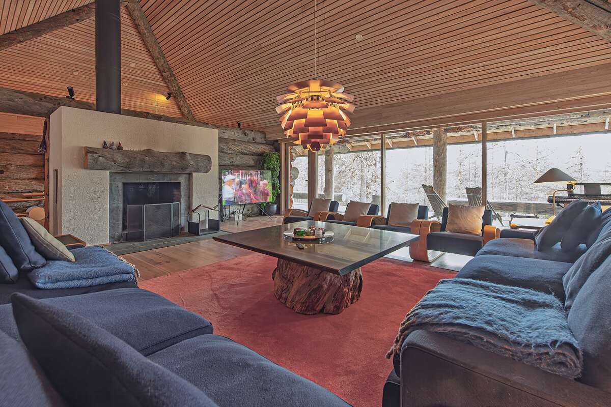 Im Blockhaus findet sich eine grosszügige Küche, ein Wohnzimmer mit grossem Kamin und traumhafter Aussicht auf die verschneiten Landschaften, ein separates Esszimmer sowie eine grosse Sauna mit Duschen und ein weiterer Loungebereich.