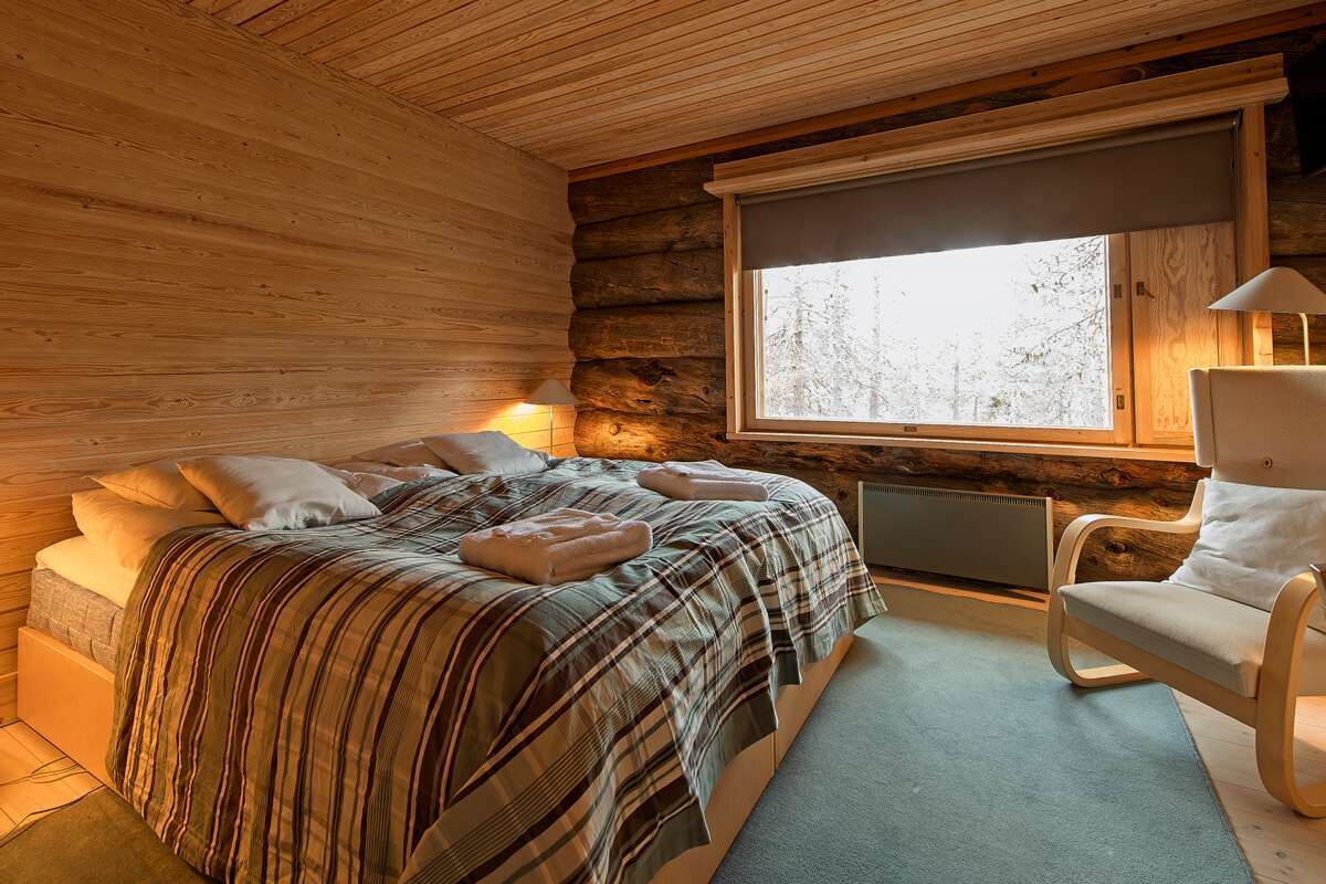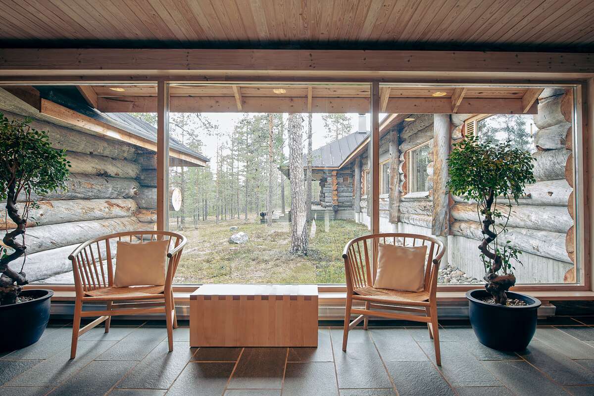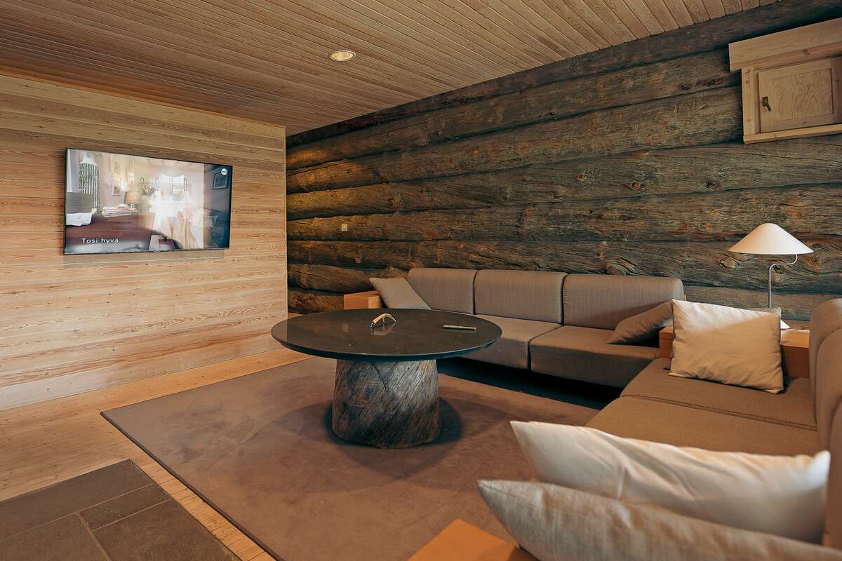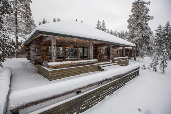 Im Blockhaus findet sich eine grosszügige Küche, ein Wohnzimmer mit grossem Kamin und traumhafter Aussicht auf die verschneiten Landschaften, ein separates Esszimmer sowie eine grosse Sauna mit Duschen und ein weiterer Loungebereich.