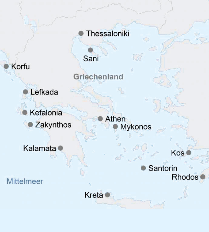 Geografische Eigenschaften: 80 % Festland, geprägt von fruchtbaren Tälern, Olivenhainen und weiten Gebirgszügen (höchster Gipfel: Olymp, 2.917 m). Mehr als 3.000 Inseln mit idyllischen Buchten, weissen Sandstränden und dramatische Felsformationen