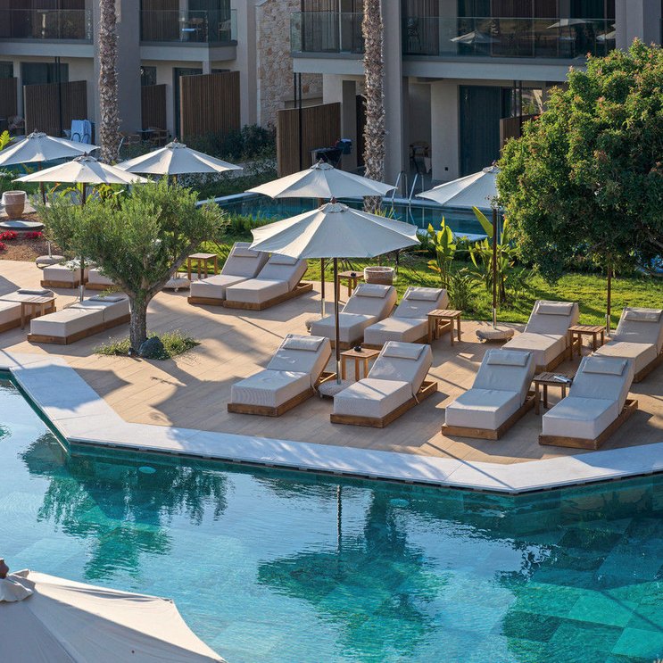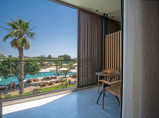 - 26-30 qm, Doppel, Poolblick, 1 Bad, Dusche, Bademantel, Badeslipper, Haartrockner, Klimaanlage, Ventilator, Minibar kostenpflichtig, Safe, TV (Sat-TV), Bluetooth-Lautsprecher, Wasserkocher, Kaffee/Tee, Terrasse (möbliert), direkter Poolzugang, Gemeinschaftspool, bei Ankunft im Zimmer Wasser