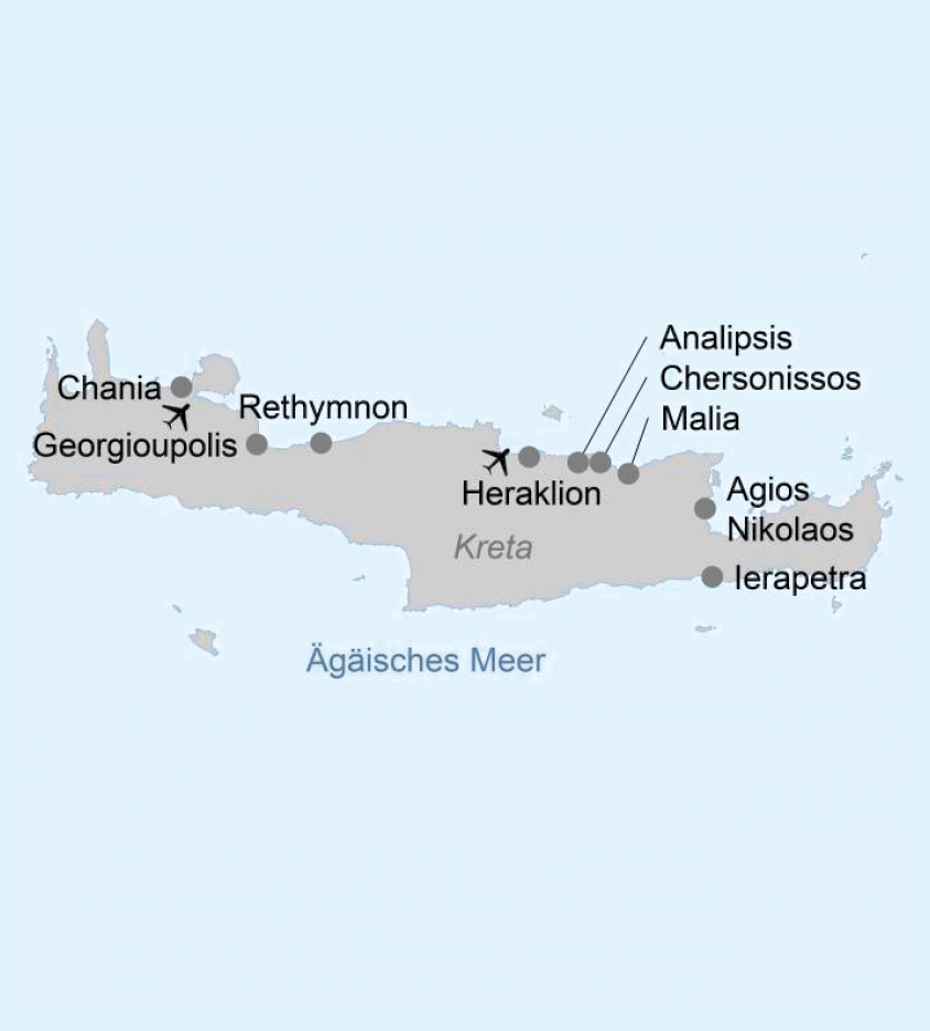 Ja, in der Hauptsaison (April bis Oktober) gibt es Direktflüge von Zürich, Genf und Basel nach Heraklion und Chania. Die Flugzeit beträgt ca. 2,5 bis 3 Stunden.