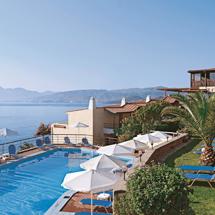 Am Hang über der Mirabello-Bucht erbaut eröffnet sich Gästen vom Resort aus ein Traumblick über das Meer. Sie wohnen in Zimmern, Suiten oder großen Villen mit privatem Pool. Auch das Spa bietet Meerblick – und eine Vielzahl an Wellness-Verwöhnbehandlungen.