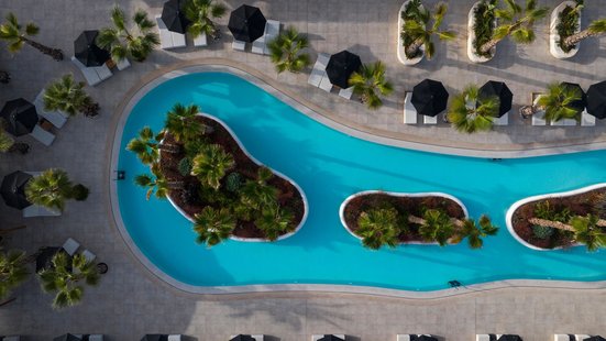 - 26-30 qm, Suite, Doppelbett, 1 Bad, Dusche, bodengleiche Dusche, WC, Bademantel, Badeslipper, Haartrockner, Klimaanlage, individuell regulierbar, Minibar kostenpflichtig, Safe, Bügeleisen, Trockner, 1 TV (Sat-TV, Flachbildschirm), WLAN, Kaffee/Tee, Kühlschrank, Terrasse (möbliert), direkter Poolzugang, Privatpool, hochwertige Badartikel