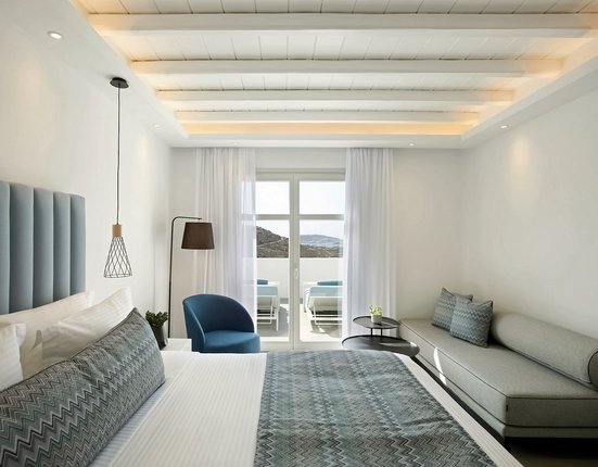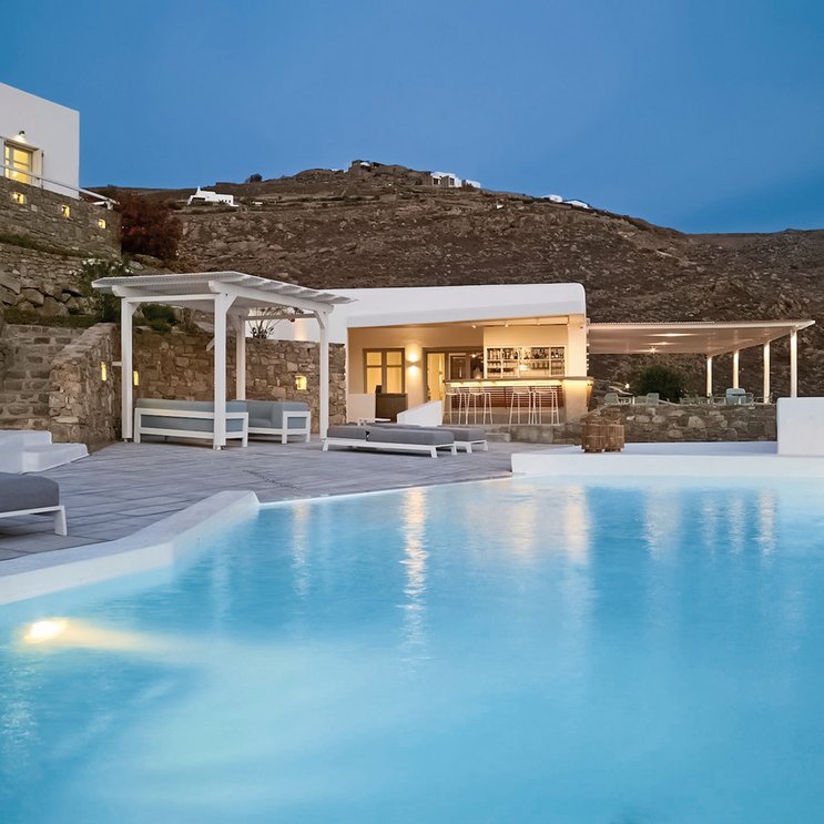 Hoch auf einem Hügel über der Bucht von Houlakia, mit all der Privatsphäre, die eine solche Lage mit sich bringt, bietet das exklusive Design-Hotel einen atemberaubenden Blick bis zu den Inseln Tinos und Syros.