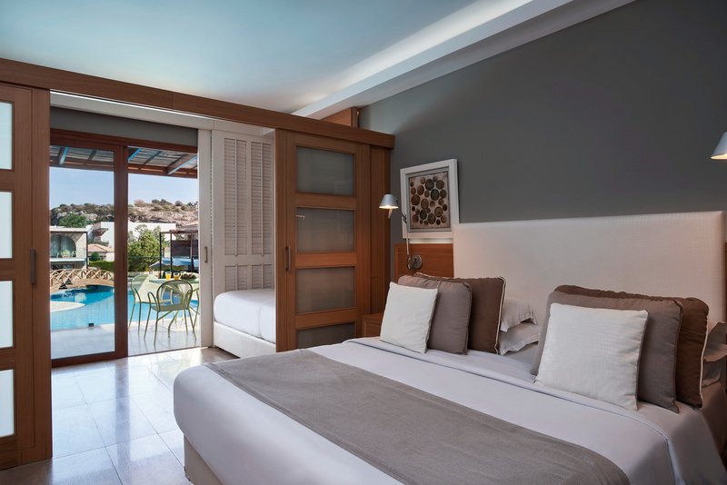 - 31-35 qm, Doppel, 2 Einzelbetten, 1 Doppelbett (Queensize), 1 Bad, Dusche oder Badewanne, Bidet, Haartrockner, Klimaanlage, individuell regulierbar, Minibar, Safe, 1 TV (Sat-TV, Flachbildschirm), WLAN, Terrasse, direkter Poolzugang, Gemeinschaftspool