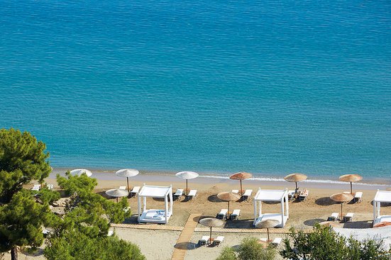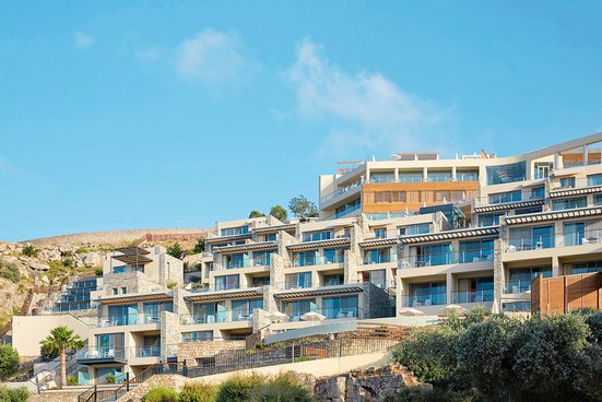 Das sonnendurchflutete Adults-only-Hotel zählt zu den „Small Luxury Hotels of the World“. Die Loungebar bietet einen traumhaften Blick auf die Ägäis. Am Strand laden Pavillions mit Doppelliegen, ein Sonnendeck und komfortable Sonnenliegen zum Relaxen ein.