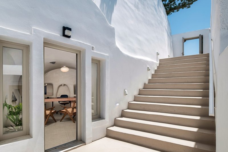 Weit oben, am Ortsrand von Firostefani, bietet sich schon zum Frühstück ein atemberaubender Blick auf die Caldera! Und auch sonst weiß das Hotel zu bezaubern: mit moderner Eleganz und traditionellen Design-Elementen.