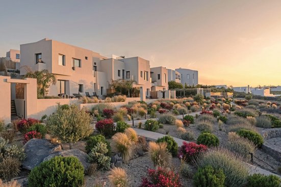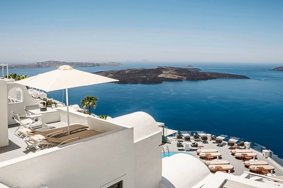In Fira, dem Hauptort der Insel, mit Panoramablick auf die umliegende Inselwelt und die tiefblaue Ägäis, durch die weiße Schiffe kreuzen. Einen herrlichen Blick haben Sie von der Poolbar aus. Atemberaubend sind die Sonnenuntergänge, hier am Rand des Vulkankraters.
