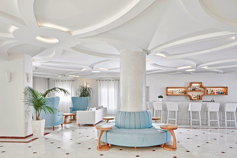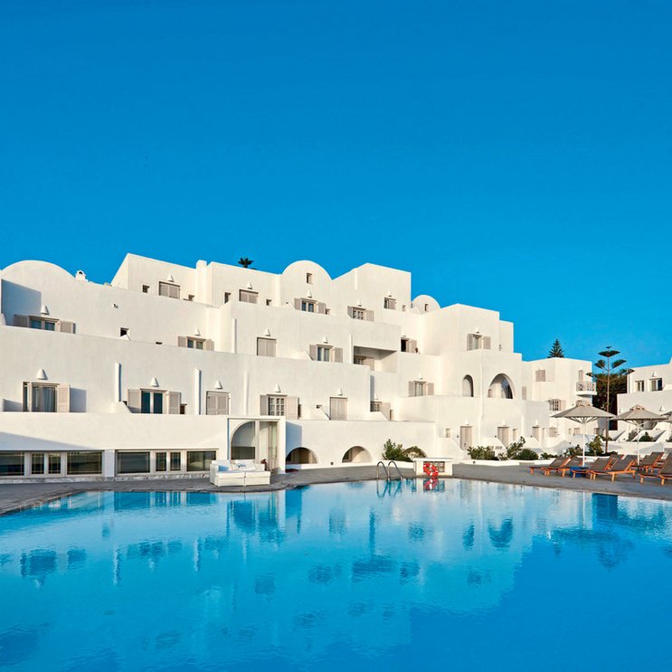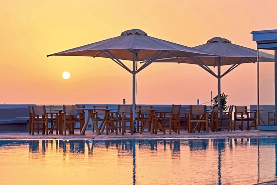Mit seinem strahlenden Weiß steht das komfortable Hotel in typischer Kykladen-Architektur im reizvollen Kontrast zum tiefen Blau der Ägäis, die ihm zu Füßen liegt. Ideal für entspannten Urlaub!