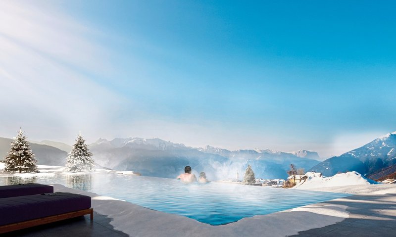 Aguamenti Familienbereich mit Indoor-Pool mit Verbindung zum Outdoor-Infinity-Pool mit 360-Grad-Panoramablick, Babybecken, Nichtschwimmerpool mit Rutsche, Jugend-Actionpool mit Breitwellenrutsche und Röhrenrutsche, Familiensauna, Ruheräume für Groß und Klein sowie Snackbar. Der Adults-Only-Bereich bietet einen Outdoor-Whirlpool auf der Dachterrasse, Nacktschwimmbad, Kneippsee und Tauchbecken. In der Adults-Only-Wärme & Relaxoase