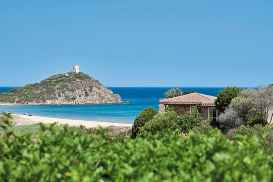 In Hanglage, inmitten des Chia Laguna Resorts, mit herrlichem Blick über den Strand Monte Cogoni. In der Ferne wacht der bekannte Turm Torre di Chia - malerisch!