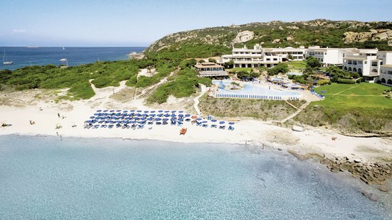 Nirgendwo leuchten Sardiniens Farben strahlender! Das Azurblau der Poollandschaft scheint sich über mehrere Ebenen im Türkisblau und Smaragdgrün des Meerwassers zu verlieren, nur unterbrochen vom strahlend weißen, feinen Sandstrand. Himmlisch!