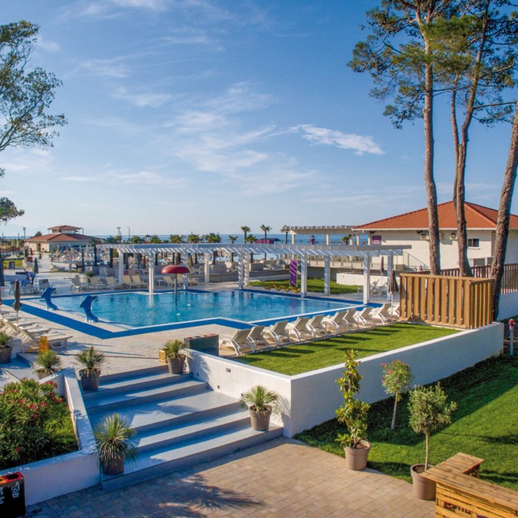 Umrahmt von Bergen und Meer empfängt Sie dieses moderne Hotel an der Adria. Genießen Sie den Meerblick. Wer mehr Raum benötigt, kann einen Bungalow im Kiefernwald buchen.
