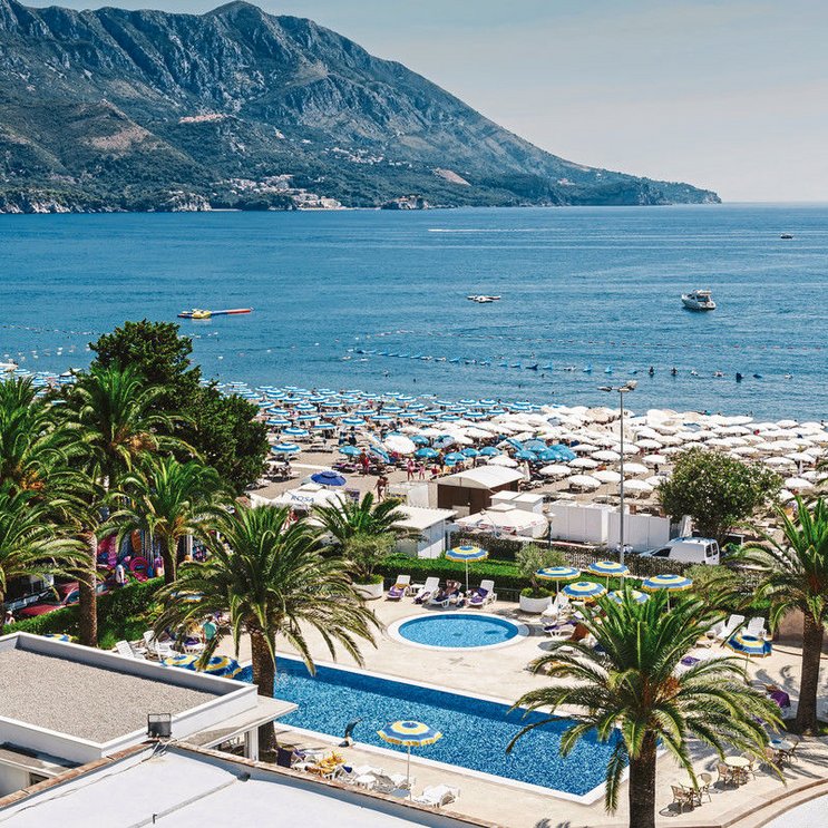 - Kiesstrand: gehört zur Anlage, von der Anlage getrennt durch Promenade, Sonnenschirme, Liegen, Strandtuch/Badetuch