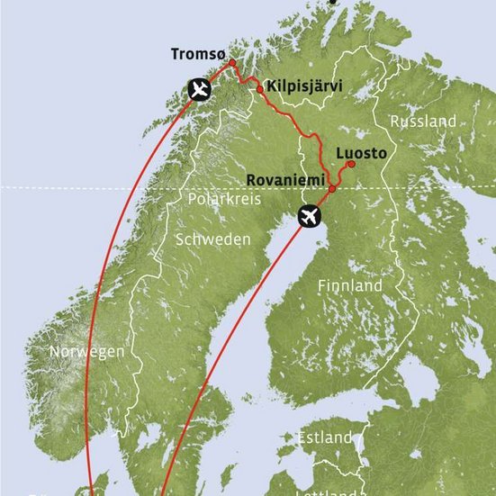 Ihre Reise startet in Finnland, wo Sie ruhige Tage in einer Blockhausatmosphäre geniessen und Zeit haben, optionale Ausflüge, wie Hundeschlittentouren oder Motorschlittensafaris, zu unternehmen. Nach diesen gemütlichen Tagen begeben Sie sich auf die Arctic Route. Mit dem Bus fahren Sie bis zur Grenzstadt Kilpisjärvi, welche im Dreiländereck von Finnland, Norwegen und Schweden liegt. Weiter führt die Route bis nach Tromsø, wo Sie noch etwas in das Stadtleben eintauchen können.