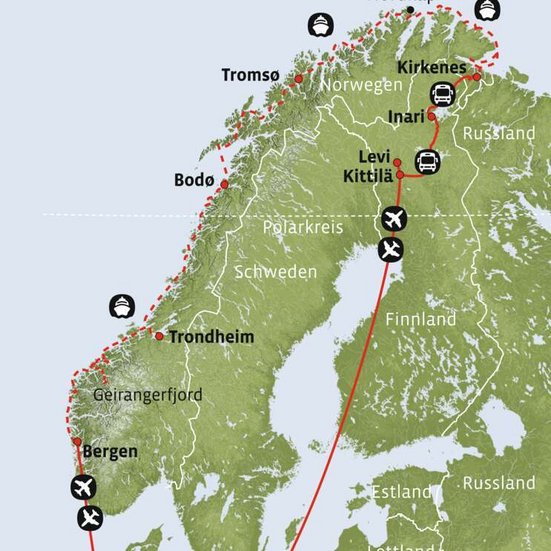 Am Morgen fahren Sie nach Kirkenes zur Einschiffung. Auch auf dieser Fahrt begleitet Sie unsere Gästebetreuer:in und Sie erfahren viel Spannendes über Land und Leute. Die Strecke führt entlang des Inari-Sees und die Wahrscheinlichkeit, unterwegs freilaufende Rentiere zu sehen, ist sehr hoch. In Kirkenes heisst es «Leinen los». Fünf Übernachtungen an Bord Ihres Havila-Schiffes.