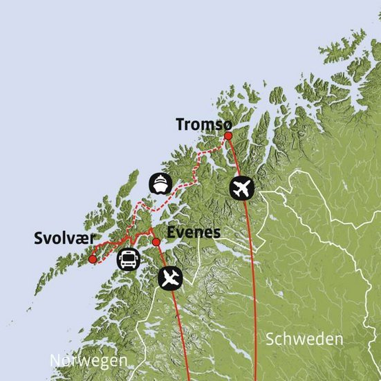 Unternehmen Sie einen letzten Spaziergang durch Svolvær oder besorgen Sie die letzten Souvenirs bevor Sie Abschied nehmen von Nordnorwegen. Danach bringt Sie der Bus zum Flughafen Evenes. Mit einem direkten Linienflug kehren Sie gegen Abend bequem in die Schweiz zurück.