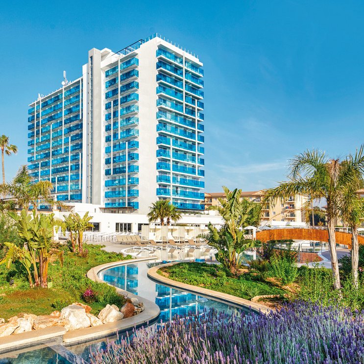 Nur ein Highlight dieses stylishen Hotels: der fantastische Blick von der Dachterrasse mit Sky-Bar, Jacuzzi und Restaurant. Pools, Kinderpool und die Gartenlandschaft laden unten zum Entspannen ein.