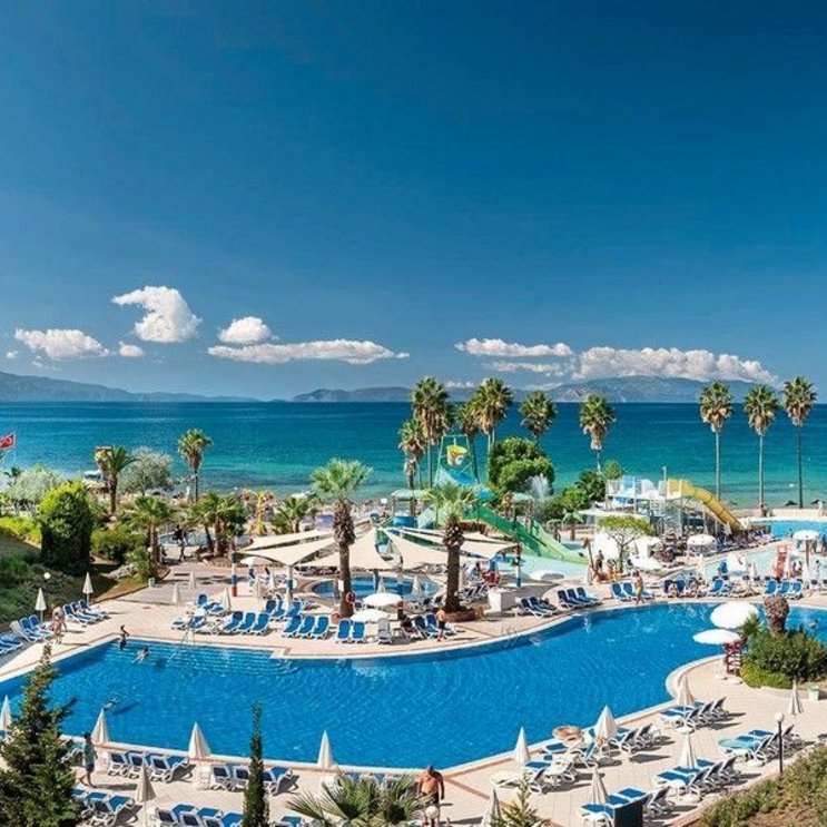 Umgeben vom tiefen Blau der Ägäis finden vor allem Familien hier ihr Urlaubsglück: der schöne Long Beach vor der Tür, mehrere Pools und Kinderpools, Wasserrutschen und All Inclusive vom Feinsten – wunderbar!