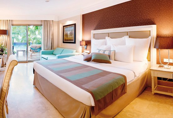 - 31-35 qm, Poolseite, kombinierter Wohn-/Schlafraum, Doppelbett (Kingsize), Sofabett, Dusche, WC, Haartrockner, Kosmetikspiegel, Klimaanlage, zentral gesteuert, Minibar, Auffüllung regelmäßig, Safe, TV (Sat-TV, Flachbildschirm), Wasserkocher, Kaffee/Tee, Terrasse, direkter Poolzugang