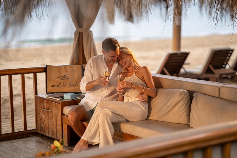 - Sandstrand: leicht abfallend, gehört zur Anlage, ca. 220 m lang, Sonnenschirme, Liegen, Liegenauflagen, Cabaña (kostenpflichtig)