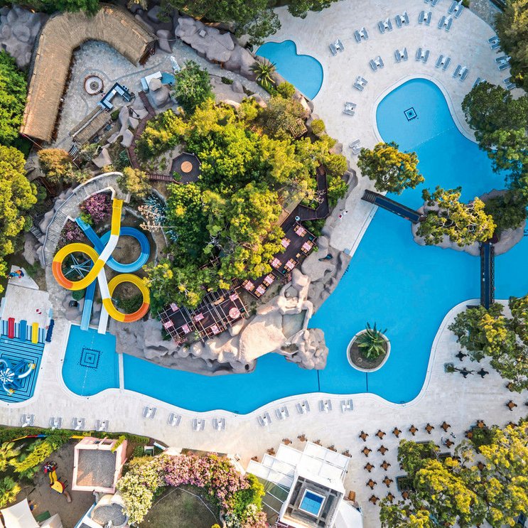 - 1 Pool: Süßwasser, Wasserrutschen: 5 (stundenweise in Betrieb), Sonnenschirme, Liegen