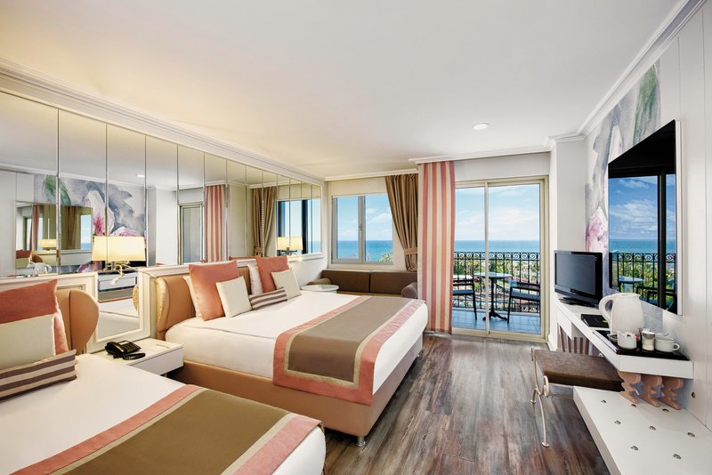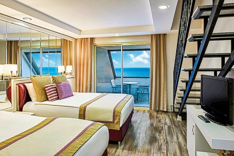 - Doppel, Meerblick (seitlich), Couch, 1 Einzelbett, 1 Doppelbett, 1 Bad, Dusche, Haartrockner, Laminatboden, Klimaanlage, zentral gesteuert, Minibar, Auffüllung regelmäßig, Safe, 1 TV (Sat-TV), Telefon, Balkon