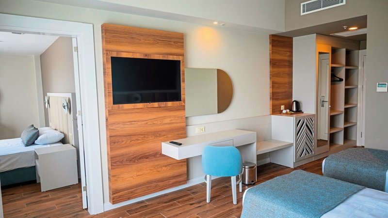 - 41-45 qm, Familien, 2 separate Schlafzimmer, Dusche, bodengleiche Dusche, WC, Haartrockner, Fliesen, Klimaanlage, zentral gesteuert, Minibar, Auffüllung täglich, Wasser, Safe (kostenpflichtig), 2 TVs (Sat-TV, Flachbildschirm), WLAN, Wasserkocher, Kaffee/Tee, Balkon
